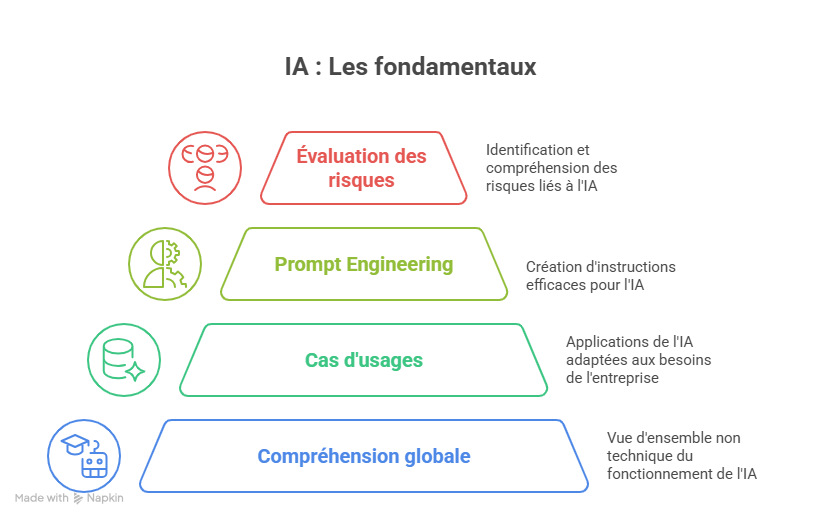 Objectif : Comprendre le fonctionnement global de l’IA (sans technique), identifier les cas d’usage pertinents pour votre entreprise, maîtriser les bases du prompt et anticiper les risques (éthique, sécurité, dépendance).